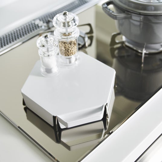 カバーを使わない時はコンロ奥などに立ててスリムに収納可能。