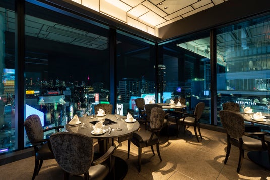 渋谷駅の真上にそびえ立つ「渋谷スクランブルスクエア」、その12階に銀座アスター渋谷スクランブルスクエア店は、2024年7月にオープンいたしました。視界を遮るものがなく、足元から天井まで一面ガラス窓になっており、地上を歩く人の姿から遠くのビル群、木々の緑まで、すべての席から景色が見渡せます。店内の内装やインテリアはシックで落ち着いた雰囲気を醸しつつ、刀で斬ったような直線的なデザインが壁面やエントランスなどに施されているため、モダンでおしゃれな空間が楽しめます。
