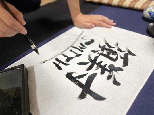 記念にのこる「てぬぐい」で書道体験を行い、記念にお持ち帰りいただけます。