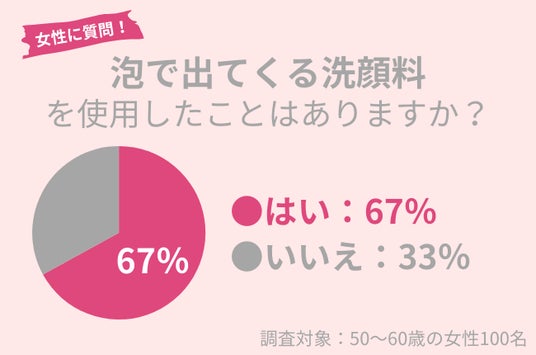 調査の結果、50代女性のうち、67%と大部分の方が「泡で出てくる洗顔料」を使用したことがあるとわかりました。