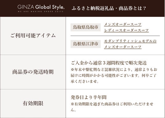 オーダースーツ専門店「GINZAグローバルスタイル」を運営するグローバルスタイル株式会社(東京証券取引所 スタンダード市場:7126、本社:大阪市中央区、代表取締役社長 田城弘志)は、ふるさと納税の返礼品として大好評のグローバルスタイルのふるさと納税を【さとふる】【JRE MALL】【ふるさとプレミアム】でも新たにお取り扱い開始いたしました。返礼品には、島根県・江津市にある提携工場トップソーイング社と鳥取県・鳥取市のグッドヒル社の共同企画により、全国のグローバルスタイルでご利用いただける「商品券」をご用意しております。