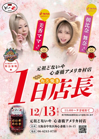株式会社アドジックス(本社:大阪府大阪市北区/代表取締役:藤末 雅彦)が運営する元祖どないや心斎橋アメリカ村店は、2024年12月13日金曜日にTiKToKライバーの美香ママさんと朝比奈舞奈さんが1日店長イベントを開催することが決定しました。