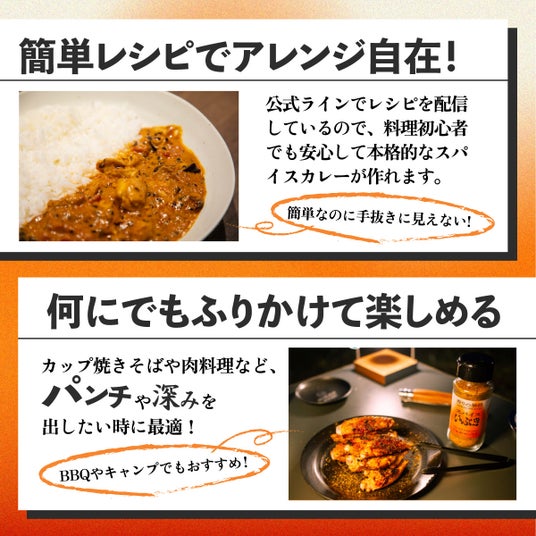 スパイスカレー初心者の方にとっては、個別のスパイスの比率を調整しながら配合する難易度は高く、入手自体が困難なスパイスもあります。また、家庭で作る量ではスパイスを使い切れず余りが出てしまうこともあります。「スパイスいぶき」では、塩も含めた各種スパイスをあらかじめミックスすることで、これらの問題を解決し、調理工程を簡略化しました。これにより、普段手の込んだ料理を作らない方でも迷わず作れる簡単なレシピを実現しました。LINE公式アカウントでは、料理初心者でも簡単に本格的な料理が作れるよう「スパイスいぶき」を使った「おすすめレシピ」を配信しています。