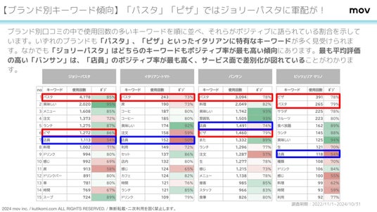 いずれのブランドも「パスタ」、「ピザ」といったイタリアンに特有なキーワードが多く見受けられます。なかでも「ジョリーパスタ」はどちらのキーワードもポジティブ率が最も高い傾向にあります。