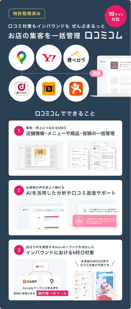 口コミコムは、国内外の口コミサイトを”もっと”売上に変える「口コミサイトの一括管理ツール」です。口コミの情報を活かした店舗改善やGoogleマップ・口コミサイトからの集客数増加を支援します。