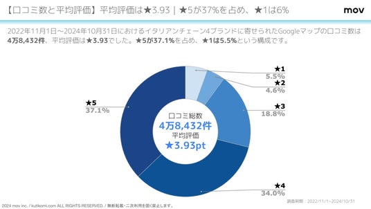 2022年11月1日~2024年10月31日におけるイタリアンチェーン4ブランドに寄せられたGoogleマップの口コミ数は4万8,432件、平均評価は★3.93でした。