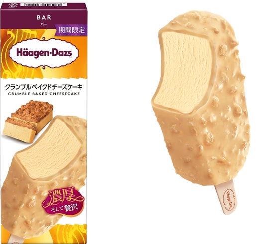 本商品は、ベイクドチーズケーキの濃厚な味わいに、ザクザクとした食感のクランブル※を組み合わせた、食べ応えのあるアイスクリームバーです。チーズの濃厚な味わいとタルトやクッキーの食感が楽しめるベイクドチーズケーキをハーゲンダッツバーにアレンジしました。寒い季節に食べたくなるコク深い味わいとバーならではの満足感をご堪能ください。