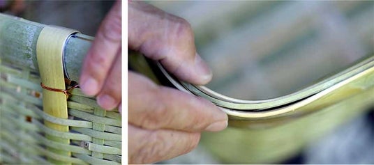 また、両面に表皮を使用した縁部分や底の力竹など、細部まで設計にこだわっています。手にしっかりなじむ持ち手部分は、ビニールパイプでカバーされており、長時間の持ち運びでも手が痛くなりません。