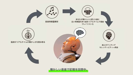 本研究により、個々の「懐かしさ」を感じやすい音楽を自動的に選定する技術が開発されました。この技術はうたメモリーに用いられており、音楽に対する懐かしさの評価、音楽の特徴、そして音楽を聞いている際の脳波データをもとに、各個人に合わせた懐かしい曲を選び出します。
