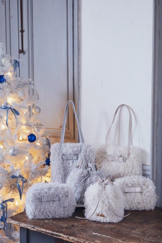 ふわふわの雪を連想させるファー使いのバッグは、小さなリボンを組み合わせ、日常使いしやすい3型を取り揃えました。また、輝く雪片をラインストーンやシャイニー素材で表現したショルダーバッグやラウンドポーチ、アクセサリーもラインアップ。