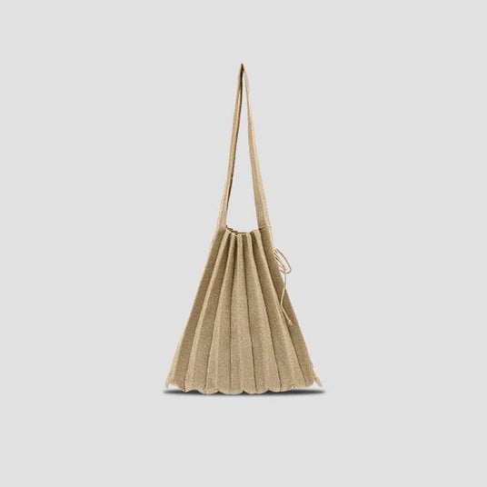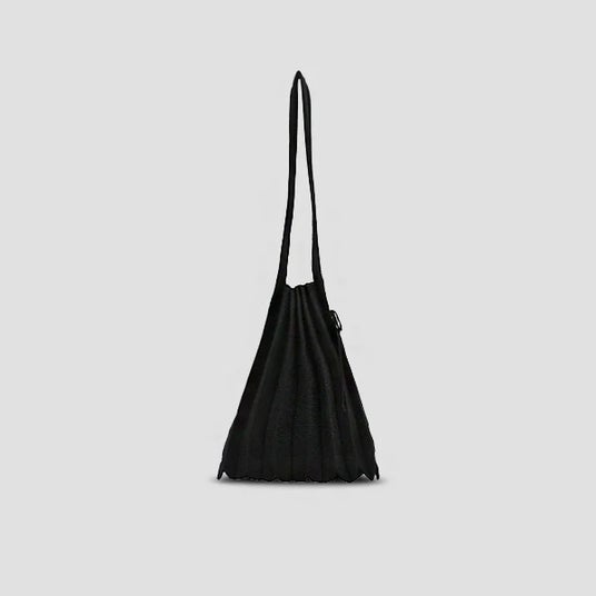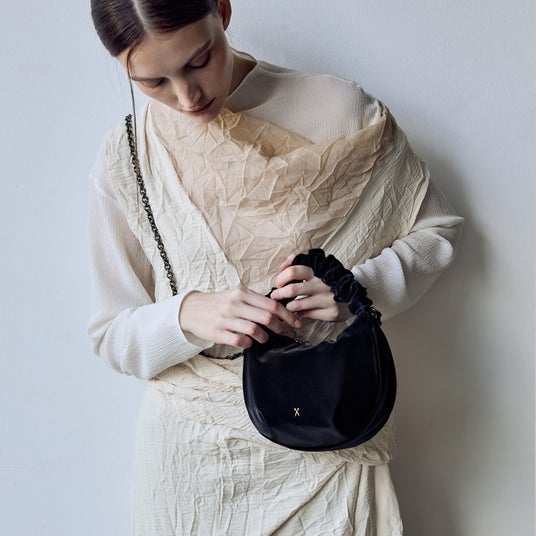 触り心地が柔らかく、シワがつきにくい上に、控えめな光沢が特徴の独自の素材で作られたバッグです。ストラップを使ってトートバッグやクロスバッグなど、さまざまなスタイリングが可能な、収納しやすい実用的なサイズが魅力です。