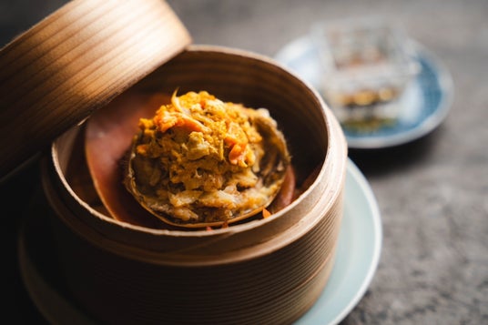 上海蟹の甲羅に上海蟹の身とみそをほくしてのせた姿蒸し。