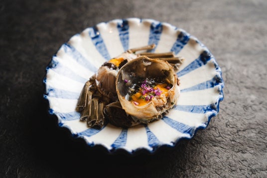 気仙沼産のヨシキリザメの姿煮込みに上海蟹の甲羅がのったインパクトのある一皿。