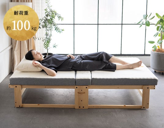 耐荷重は安心の約100kg。グラつきや軋みを軽減する設計で、布団でもマットレスでも据え置きベッドのような安定感のある寝心地を叶えます。