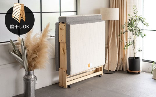 和布団を載せたままベッドを折りたためて、陰干しも簡単。専用マットレスを使えば、マットレスも載せたまま折りたためます。(※専用の折りたたみマットレスは別売り)