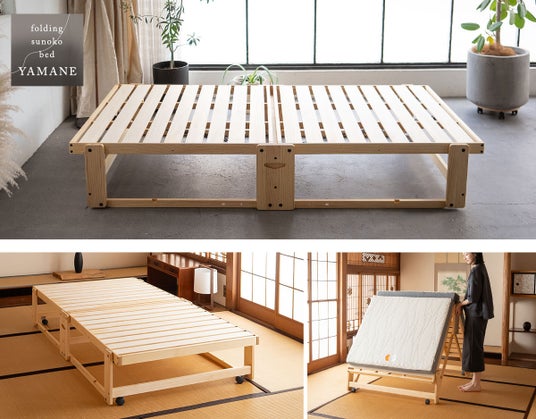 木製折りたたみベッド「やまね」は、日本の住環境に配慮した理想的なベッド。スチール製では味わえない木の温かみと高い通気性、簡単な操作性で、快適な睡眠と居心地の良い空間を提供します。また、専用マットレスとのセット販売も行っています。