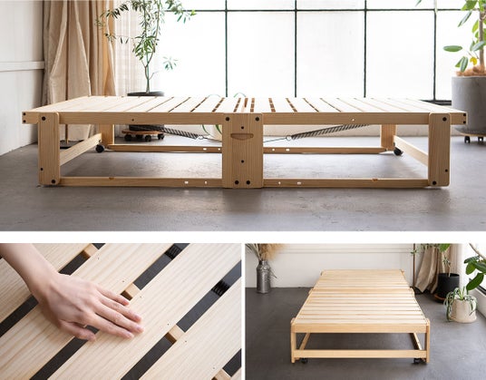 通気性と除湿効果に優れた天然パイン無垢材を使用し、頑丈で温かみを感じられるデザインの折りたたみベッド。据え置きベッドと同等の安定感と寝心地を実現しました。
