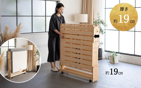 折りたたむと厚さ約19cmになり、キャスター付きで手軽にクローゼットや壁際に収納できます。狭小な寝室でも広々使うことができます。また、組立不要で届いたらすぐに使えます。組立が苦手な方や、組立スペースが無い方でも安心。遠くに住むご家族への贈り物や高齢者施設にもおすすめです。