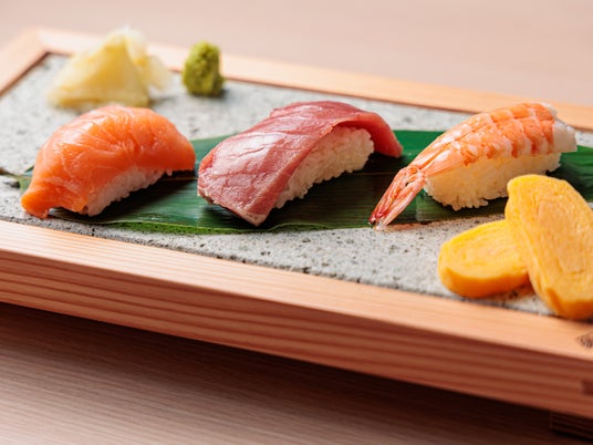 訪日外国人に人気のサーモン、中トロ、えびが美しく並ぶ。