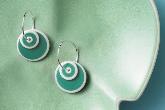 デンマークのアクセサリーブランド「シェアニング」が初登場。白磁にグリーンの組み合わせが爽やかなフープピアス。サイズの異なる2つの磁器パーツが重なり揺れるデザインです。