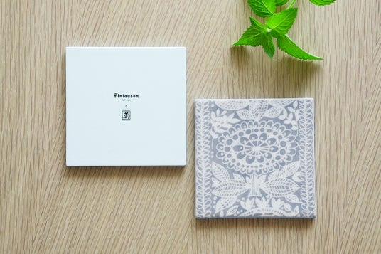 佐賀県の伊万里鍋島焼窯元とコラボレーションした限定タイルを特別販売。鍋島伝統の墨弾き技法によって「フィンレイソン」のパターンを加飾した一品。テーブルの天板やコースターなど、使い道はさまざまです。