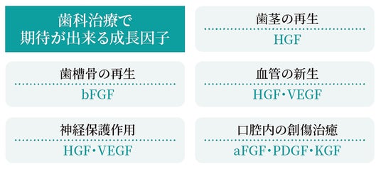 歯周組織における、細胞増殖の促進や形態形成誘導、血管新生などに関わっています。