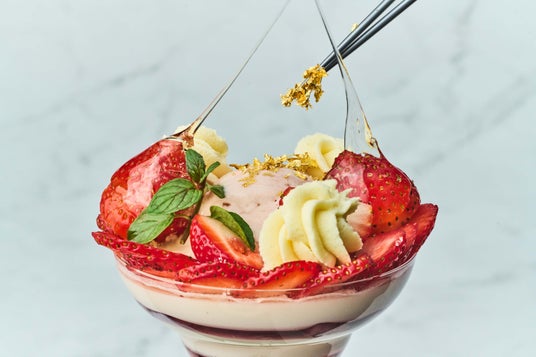 ミックスベリーのジュレ・いちごのティラミス・ホワイトチョコレートムース・粉糖・いちごのアイスクリーム・いちごキャンディー(飴細工)・いちご・金沢金箔・ミント