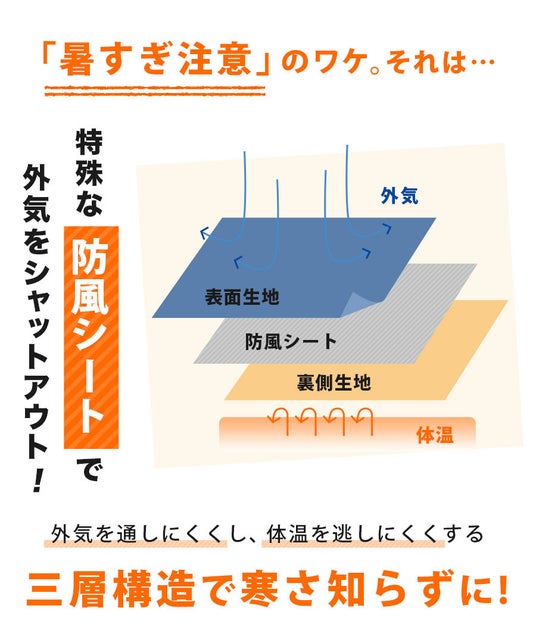 あまりに暑いため社内でも賛否真っ二つ。特殊な防風シートを挟んだ三重構造になっており、外気をシャットダウンし体温を逃しません。ぜひみなさんのお力で“暑すぎるプルオーバー”に用途を見つけてあげてください。