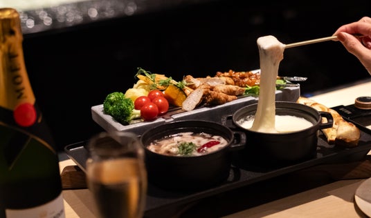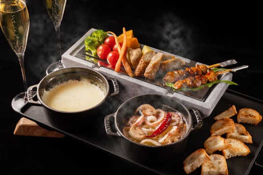 ホットプレートで提供されるチーズフォンデュは、大切な人とシェアを楽しむにぴったり。寒い冬の夜、チーズがとろける間に、バーカウンターに並ぶ二人の距離が自然と近づきます。シャンパンを片手に温かな料理を囲む、心地よいひとときをお過ごしください。
