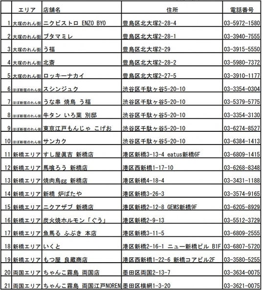 「大塚のれん街」「ほぼ新宿のれん街」「新橋・両国エリア」の21店舗にて