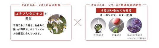 水のめぐりの阻害要因に着目し、植物性保湿成分の「ユキノシタエキス」を配合。さらに、『オルビスユー シリーズ』の共通成分である複合成分「キーポリンブースター※3」を配合し、角層のすみずみまでうるおいがめぐり満たされることで、“長時間” 明るい印象のおし返すようなハリツヤ肌へと導きます。
