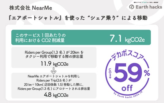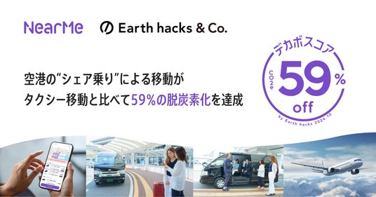 生活者の声をもとに、脱炭素関連商品・サービスや事業の開発を目指す生活者共創型プラットフォームを展開するEarth hacks株式会社(本社:東京都渋谷区、代表取締役社長:関根澄人、以下「Earth hacks」)は、移動の課題に取り組むソーシャルデザインカンパニーの株式会社NearMe(本社:東京都中央区、代表取締役社長:高原幸一郎、以下「ニアミー」)が提供する『エアポートシャトル』を使った“シェア乗り”による移動にデカボスコア提供を開始しました。今後、両社は移動に関する生活者の脱炭素ライフスタイルへの行動変容に向け、イベントやメディアでの情報発信などの連携を進めてまいります。