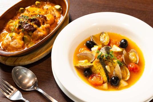 左から「鳥もも肉と季節野菜のオーブン焼き」、「お魚のアクアパッツァ風」