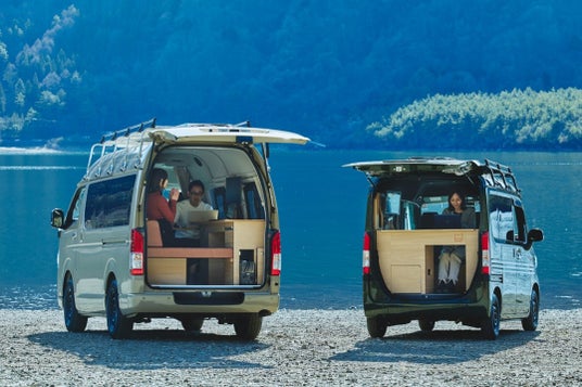 「mobica」は約30年にわたって働く場をつくるオフィス事業を手掛けてきたGOOD PLACEが考えた、好きな場所へ移動しながら車内外で快適に働くことができるワーケーションカーです。車内にはコンセントやUSB電源が搭載されたポータブル電源を積載しているほか、Wi-Fiも完備しています。シートを倒してフルフラットにすれば、身体を横にできるベッドスペースが出現します。車両はハイエース(TOYOTA)とN-VAN(Honda)をワークスペースに架装した2種類展開で、利用人数に応じて選択できます。どちらの車両も業務や気分に合わせて自由に働くスペースを選び、カスタムできる仕様です。