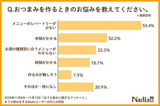 また、おつまみに関するお悩みについての質問では、1位から3位までが「メニューのレパートリーが少ない」53.4%、「手間がかかる」32.2%、「お酒の種類別に合うメニューがわからない」22.3%となり、そのほかの声として「カロリーが気になる」「食事をおつまみにしている」「節約したい」「マンネリ化してしまう」などが挙がりました。