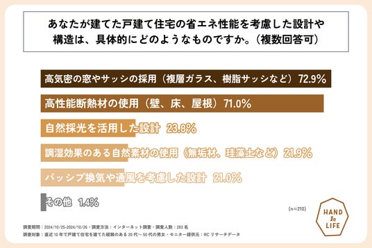次に、「戸建て住宅を建てた際に省エネ性能を考慮した設計や構造を選んだ」と回答された方に「あなたが建てた戸建て住宅の省エネ性能を考慮した設計や構造は、具体的にどのようなものか」を尋ねる設問の回答では、1位は「高気密の窓やサッシの採用(複層ガラス、樹脂サッシなど)」で72.9%、2位は「高性能断熱材の使用(壁、床、屋根)」で71.0%という結果になりました。この結果から、省エネのため住宅に高機能な素材取り入れている方が多いことがわかりました。