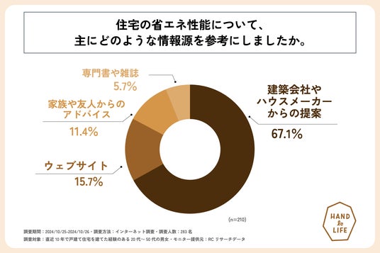 続いて、「戸建て住宅を建てた際に省エネ性能を考慮した設計や構造を選んだ」と回答された方に「住宅の省エネ性能について、主にどのような情報源を参考にしたか」を尋ねる設問への回答では圧倒的に多かったのが「建築会社やハウスメーカーからの提案」で67.1%、次いで「ウェブサイト」で15.7%という結果になりました。この結果から、自ら情報収集するというよりは建築会社やハウスメーカーからの提案によって省エネ性能を考慮した設計や構造を住宅に取り入れている方が多いことが明らかになりました。