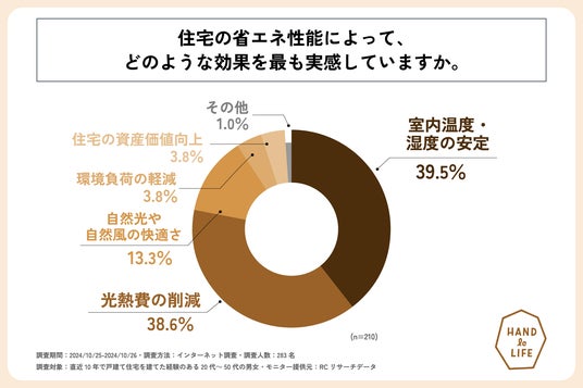 調査の最後、「戸建て住宅を建てた際に省エネ性能を考慮した設計や構造を選んだ」と回答された方に「住宅の省エネ性能によって、どのような効果を最も実感しているか」を尋ねる設問の回答では、1位が「室内温度・湿度の安定」で39.5%、2位が「光熱費の削減」で38.6%、3位が「自然光や自然風の快適さ」で13.3%という結果になりました。この結果から、経済面や快適性で省エネ性能を実感している方が多いことが明らかになりました。