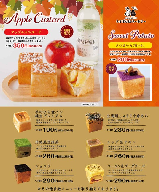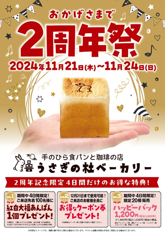 見た目にもかわいい、手のひらサイズの食パンと珈琲の店「うさぎの杜ベーカリー」島根ラピタ本店では創業2周年を記念しまして11月21日(木)より4日間限定で周年祭を開催いたします。各日先着100名様に「紅白大福あんぱん」1個のプレゼントなど3つの特典をご用意いたしました。(特典の詳細は下記に記載をさせていただきます。)手のひら食パンは11種類の定番商品に加え、季節限定のフレーバーもご用意しております。かわいくて、おいしい、思わず、ほっこり笑顔になるような“小さな食パン”の数々をお楽しみください。皆様のご来店をスタッフ一同お待ちしております。
