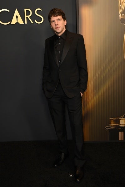 ジェシー・アイゼンバーグは、メンズ コレクションから、ブラックのウール&シルクのピークドラペルタキシードとブラックレザーのダービーシューズを着用しました。