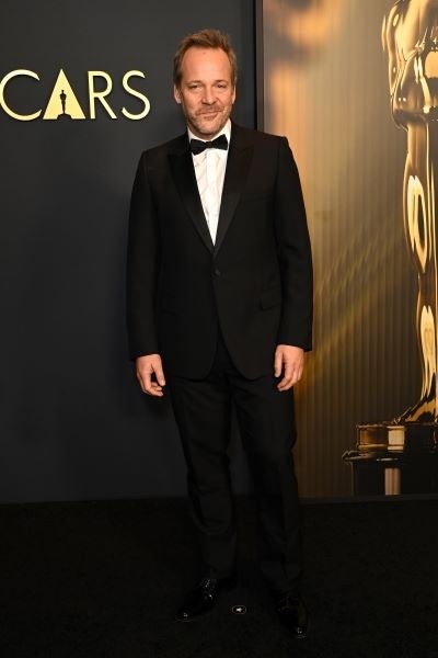 ピーター・サースガードは、メンズ コレクションから、ブラックのウール&シルクのピークドラペルタキシード、クラシックなホワイトコットンシャツ、ブラックシルクのボウタイ、ブラックのパテントレザーダービーシューズを着用しました。