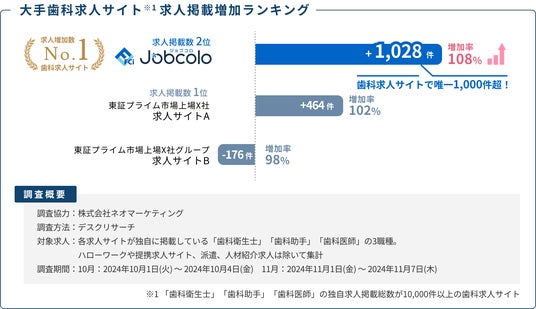 2021年のリリース以後、急速な成長によりわずか3年で「歯科求人サイト 求人掲載数2位」に上り詰めた『ジョブコロ歯科』。このたび新たに行った外部機関のマーケティング調査により、掲載数2位に到達した後も求人の増加スピードは衰えを知らず、数ある歯科求人サイトの中でも求人掲載増加数トップ、かつ唯一の1,000件増加という高い成長力を残したことが明らかになりました。