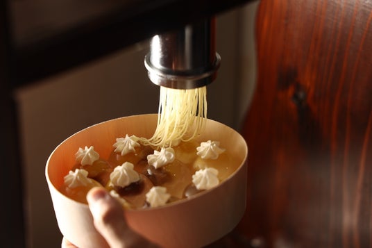 手動の絞り機を使い、繊細な和栗のクリームを慎重に絞り出している瞬間。