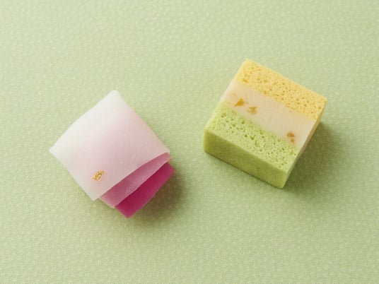 まず「紅衣(くれない)」(画像左)は、生クリームと練乳を使った餡でラズベリーピューレを包み、薄く延ばしたういろう生地で巻きあげた上生菓子。酸味とコクが好バランスなひと品です。もうひとつ、「柚重(ゆうがさね)」(画像右)は柚子香る浮島生地に、刻んだ柚子とクリームチーズを加えた羊羹を流し合わせました。生クリームや練乳、クリームチーズといった乳製品を使っているので、コーヒーや紅茶にも相性ぴったりだそう。その絶妙なマリアージュに思わず微笑んでしまいます。