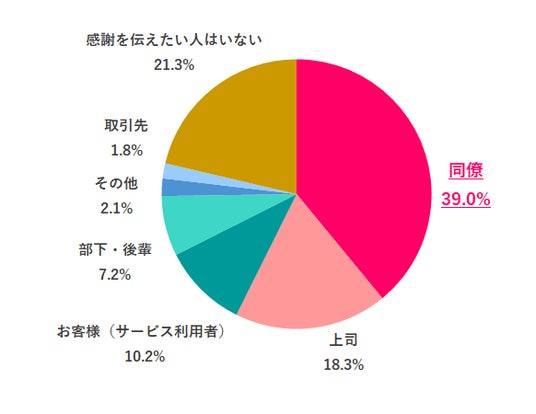 今職場の誰に1番感謝を伝えたいか聞いてみると、1位「同僚」39.0%でした。一方で「感謝を伝えたい人はいない」と答えた人は21.3%と2番目に多く、Q.4に続き意外とドライな結果となりました。