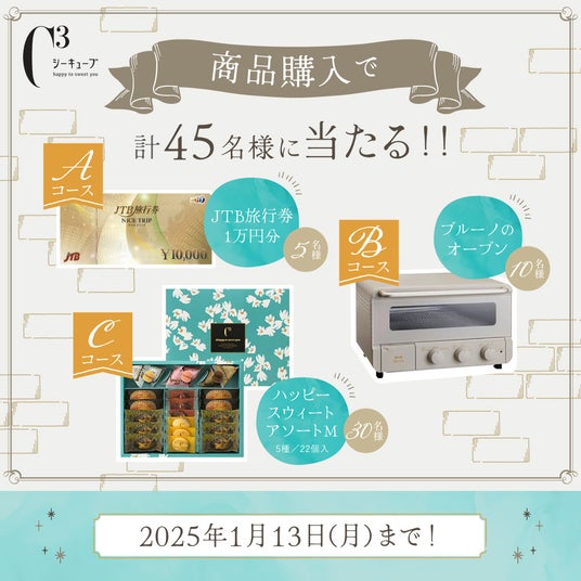 全国のシーキューブ店頭で商品をお買い上げいただきレシートを応募フォームにアップ頂きますと、1,000円(税込)一口で、JTB旅行券1万円分、シーキューブの代表商品の焼きティラミスをご自宅で温めアレンジする事ができるブルーノ スチーム&ベイク トースター、家族やお友達とも楽しめるたっぷりサイズのハッピースイートアソートM(5種/22個入)が当たるキャンペーンを展開。