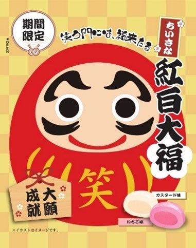 縁起の良いダルマを全面にだしたパッケージデザインでもちもちとした食感の「ちいさな紅白大福」と、お守りをイメージしたパッケージデザインで赤色と白色のえびせんをミックスさせた「紅白えびせん」の2商品です。