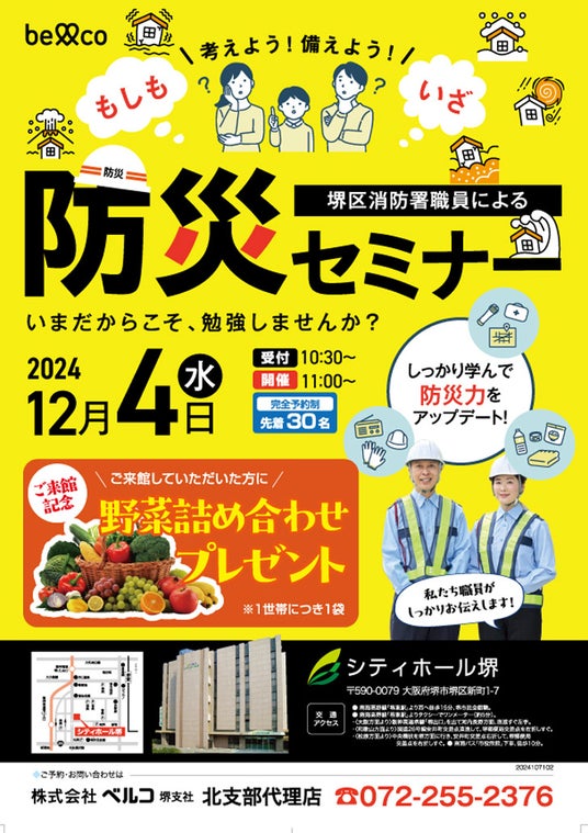 人生の二大行事である「冠婚葬祭」を、互助会という助け合い事業を通じて、お手伝いしてきた株式会社ベルコ(本社:大阪府池田市、代表取締役社長:齋藤 斎、以下「ベルコ」)は、2024年12月4日(水)シティホール堺と12月10日(火)シティホール堺西の2会場にて「堺区消防職員による防災セミナー」を開催いたします。いつ来るかわからない「大震災」に対して、同エリアの現役消防職員により講師にお越しいただき、防災セミナーを開催いたします。