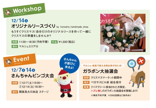 ・ビンゴ大会:クリスマスマーケットオリジナルキャラクター「さんちゃん」が遊びに来ます。事前予約不要、家具インテリアの人気アイテムなど豪華景品をご用意しております。