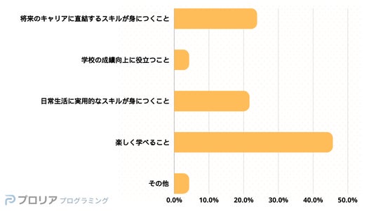 また、「将来のキャリアに直結するスキルが身につくこと」と「日常生活に実用的なスキルが身につくこと」に期待する回答はそれぞれ2割以上となっており、生きていくうえで確実に活用できるものとしてプログラミング学習が望まれているのが見受けられました。